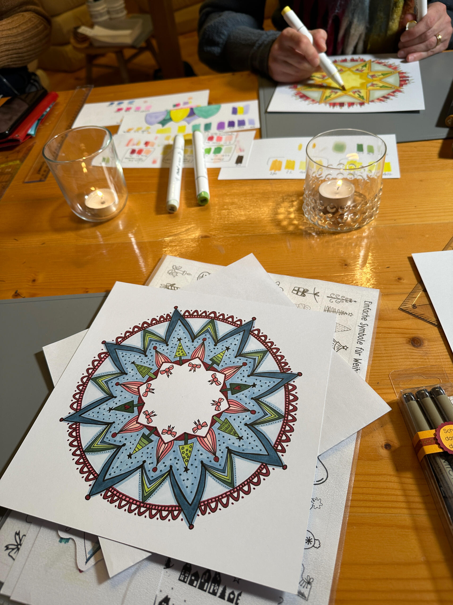 Im Mandalakurs lernst du Schritt für Schritt, dein eigenes Mandala zu entwerfen und es anschliessend mit Alkoholmarkern auszumalen.Dabei geht es nicht nur um das Erlernen einer neuen Maltechnik, sondern auch darum, in das meditative Zeichnen einzutauchen: abzuschalten, Gedanken loszulassen und im Hier und Jetzt anzukommen.